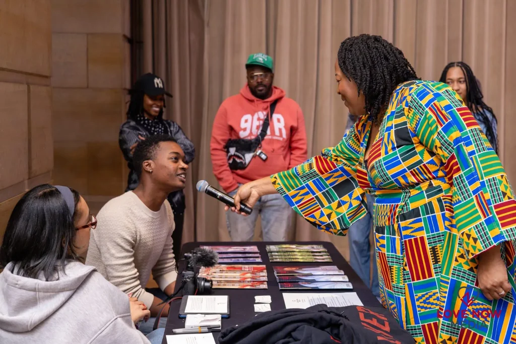 Love Now Media founder, Jos Duncan-Asé asks participant questions on love at the BeLoved Stories event on February 15, 2025. Photo credit: Tezarah Wilkins/Love Now Media