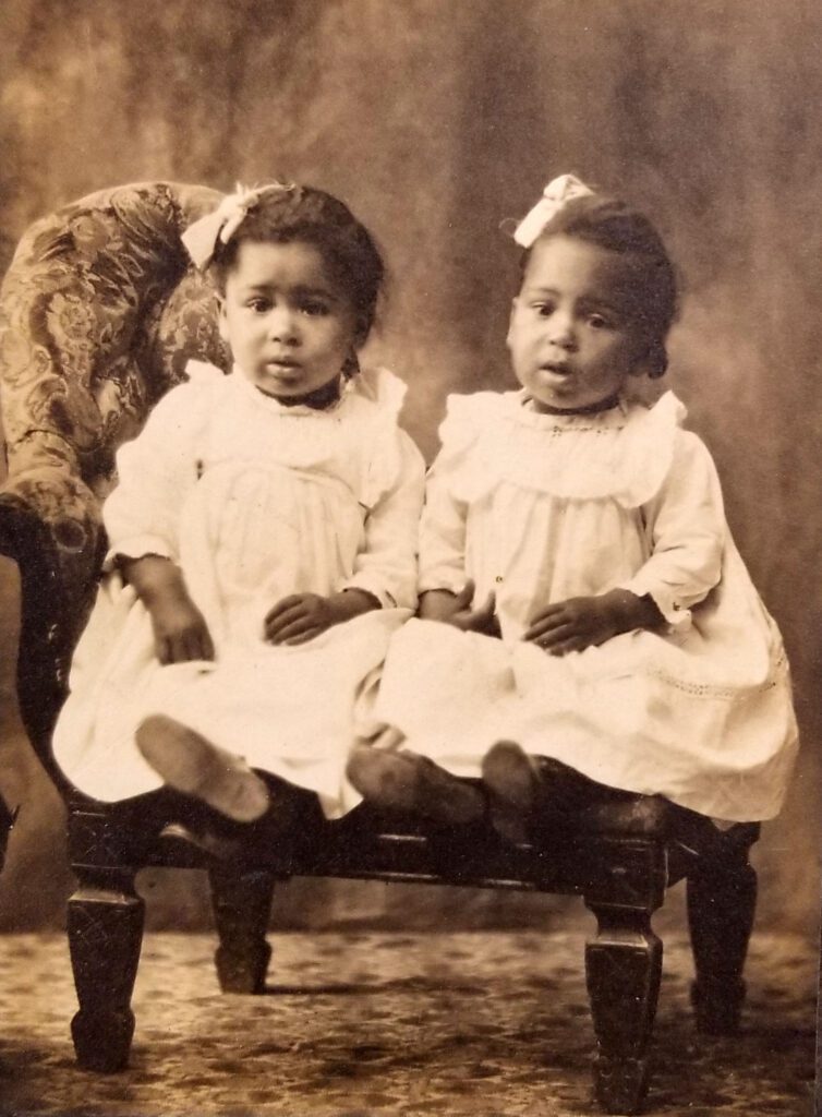 Twins girls dressed up in their finest for a photo. Photo was among others on an auction table.