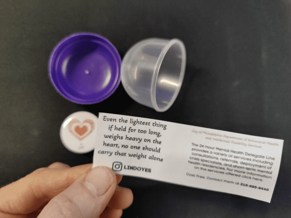 LindoYes has installed three standard, mechanical gumball machines in locations around the city, each stocked with plastic pods which would normally contain a little toy. Instead, the poet has put in each capsule a short, original poem and information on the city of Philadelphia’s Mental Health Delegate hotline.